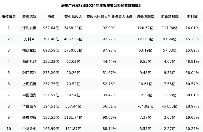 保利发展最新报告期数据为年报,下表汇总了房地产开发行业内市值靠前的公司年报主要经营数据
