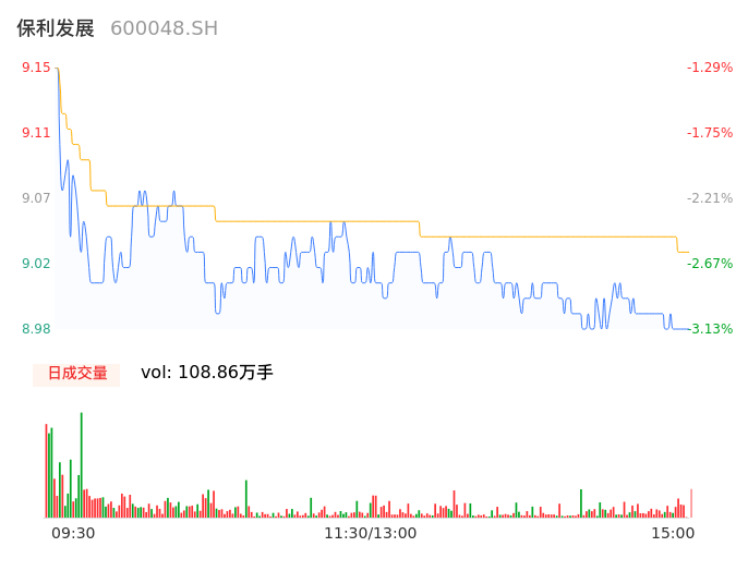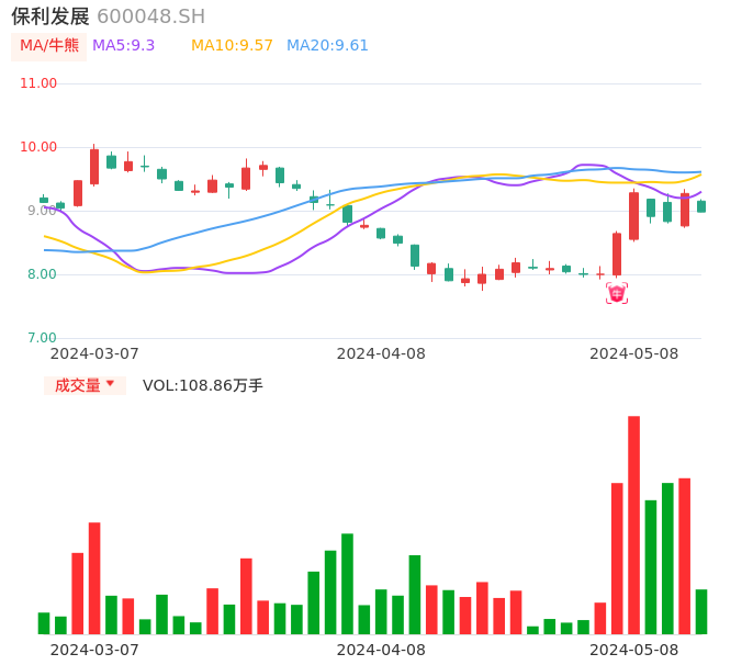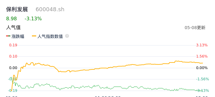 05月08日,保利发展收报8.98,股价涨幅-3.13%,成交金额9.83亿元,换手率0.91%。