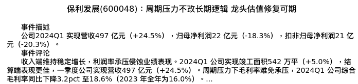 值得注意的是:2024年05月长江证券的刘义/袁佳楠/赵智勇分析师,首次发布关于保利发展的研究报告,标题为:保利发展(600048):周期压力不改长期逻辑 龙头估值修复可期。