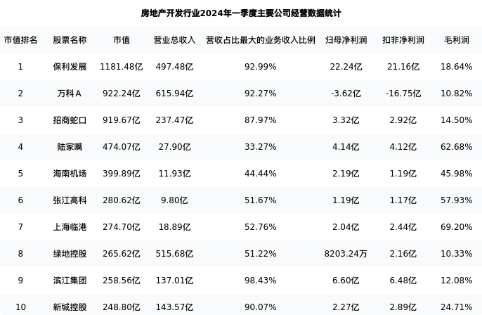 保利发展最新报告期数据为一季度,下表汇总了房地产开发行业内市值靠前的公司一季度主要经营数据