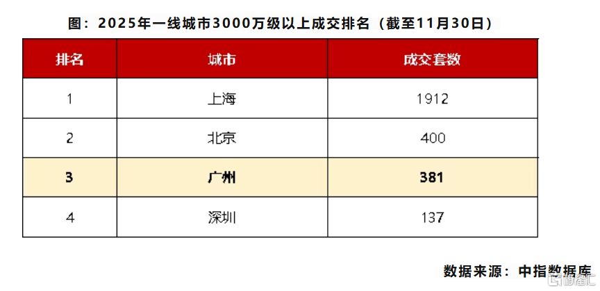 而以全国3000万+级别豪宅成交来看,据中指研究院数据显示,前11个月上海成交了1912套,北京成交了400套,广州成交了381套,深圳成交了137套。