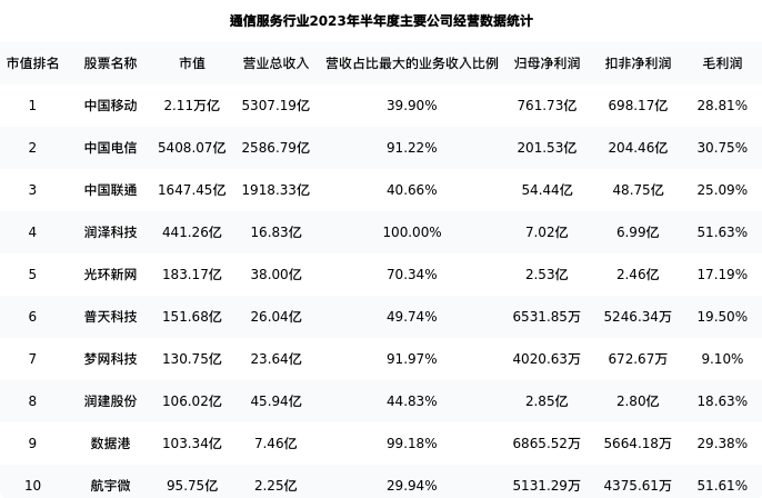 中国联通最新报告期数据为半年度,下表汇总了通信服务行业内市值靠前的公司半年度主要经营数据