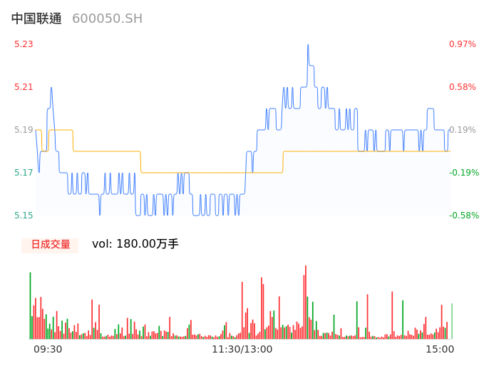 09月11日,中国联通收报5.18,股价涨幅0.00%,成交金额9.33亿元,换手率0.58%。