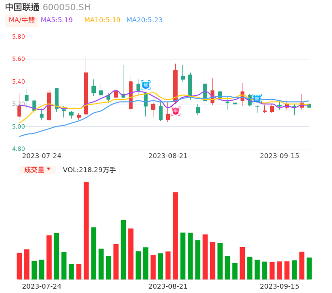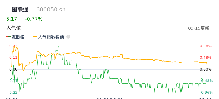 09月15日,中国联通收报5.17,股价涨幅-0.77%,成交金额11.34亿元,换手率0.70%。
