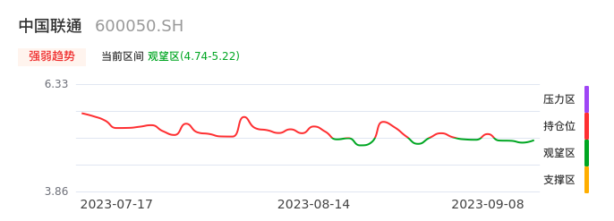 我们来看一下该股的九方特色指标强弱趋势的情况:中国联通自09月05日从持仓区下穿到观望区。股价近期持续下跌后,短期出现止跌迹象。后续重点关注能否再次站上多空分界点:5.22元。如未能有效突破则可能进入新一轮空头行情。