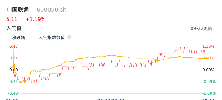 09月22日,中国联通收报5.11,股价涨幅1.19%,成交金额9.67亿元,换手率0.62%。