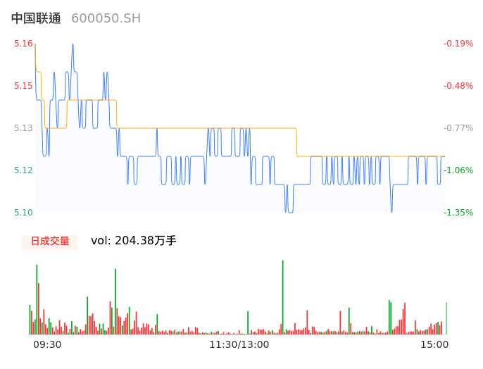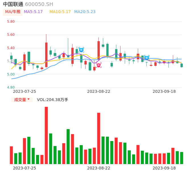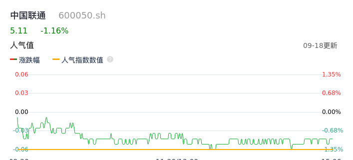 09月18日,中国联通收报5.11,股价涨幅-1.16%,成交金额10.47亿元,换手率0.66%。