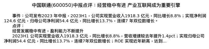 值得注意的是:2023年08月中原证券的唐俊男/李璐毅分析师,首次发布关于中国联通的研究报告,标题为:中国联通(600050)中报点评:经营稳中有进 产业互联网成为重要引擎。