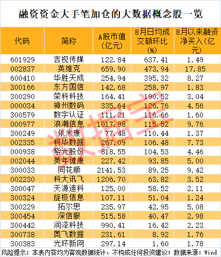 从资金面上来看,数据宝统计,8月以来融资净买入超1亿元的大数据概念股有21只,其中英维克浪潮信息同花顺华胜天成科华数据融资净买入额排在前五位。