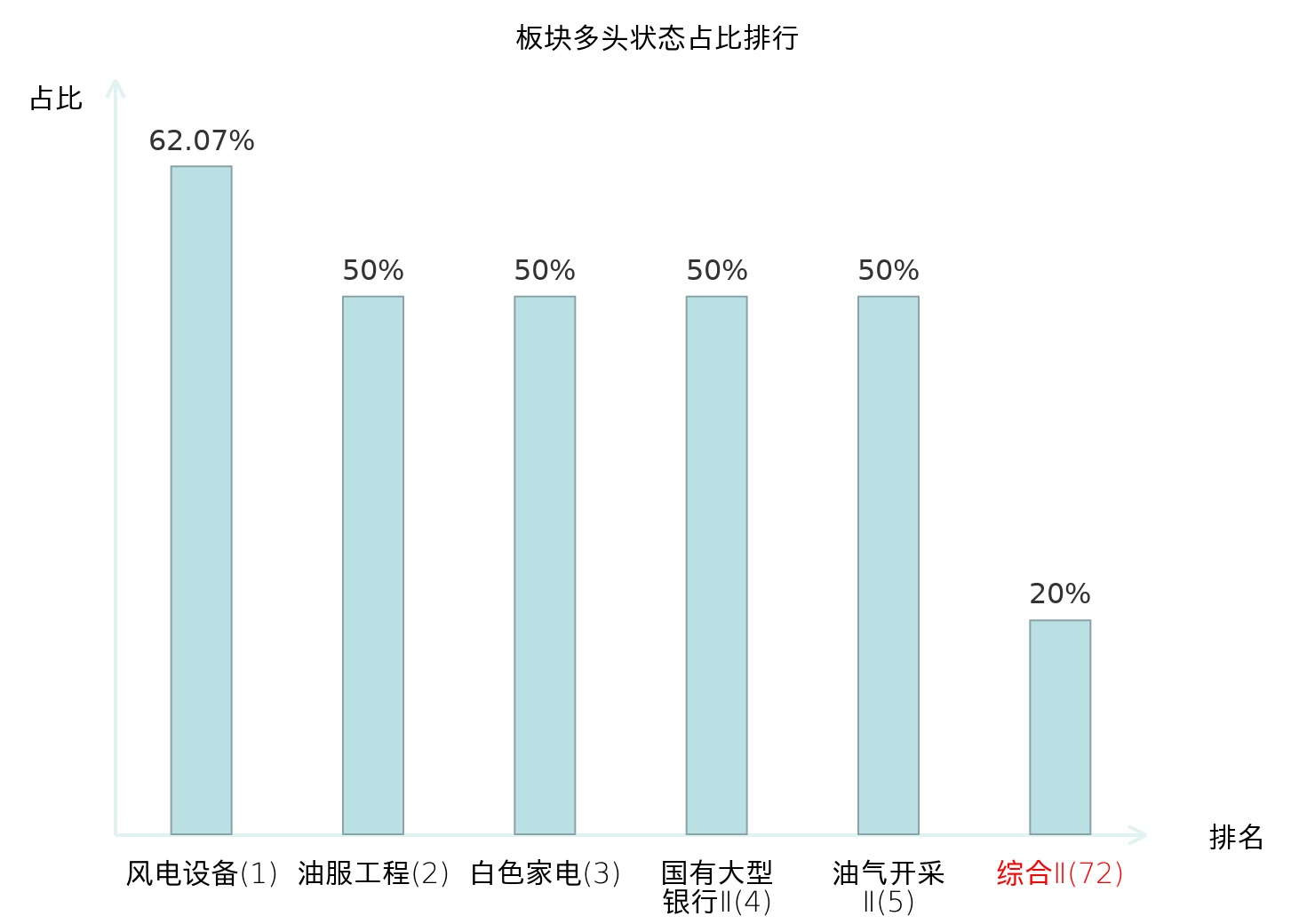 全市场所有行业板块中主力多头状态占比排名中,风电设备板块位居第一。动物保健Ⅱ板块名次提升最快,较昨日上升64位。