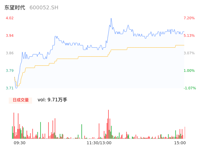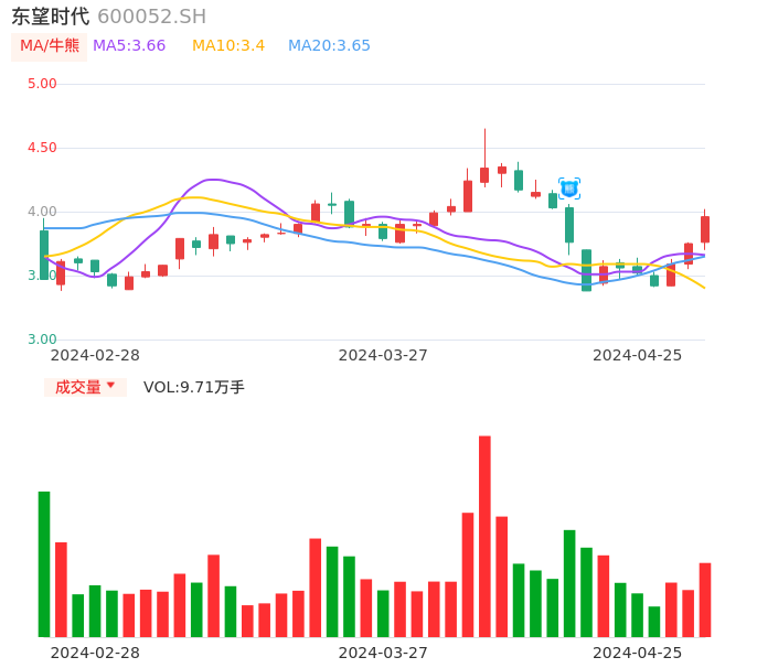 04月25日,东望时代收报3.96,股价涨幅5.60%,成交金额3784.38万元,换手率1.15%。
