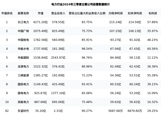 东望时代最新报告期数据为三季度,下表汇总了电力行业内市值靠前的公司三季度主要经营数据