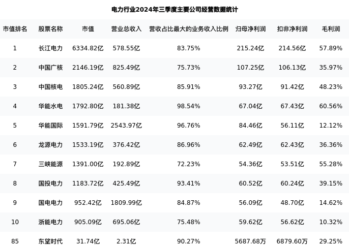 东望时代最新报告期数据为三季度,下表汇总了电力行业内市值靠前的公司三季度主要经营数据