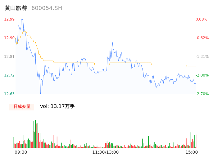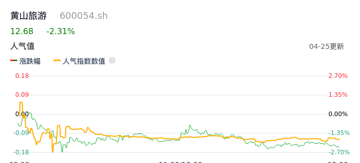 04月25日,黄山旅游收报12.68,股价涨幅-2.31%,成交金额1.68亿元,换手率2.57%。