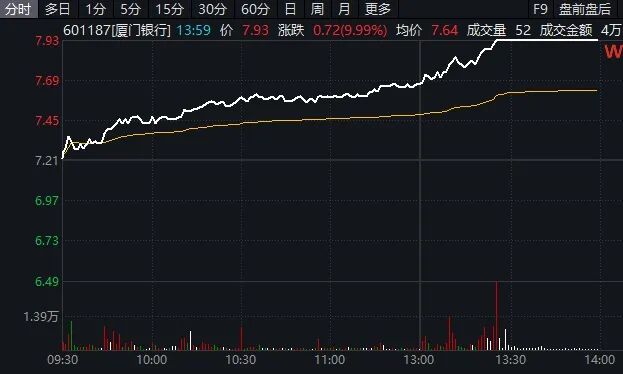 银行板块午后持续发力,厦门银行涨停,重庆银行涨超6%,上海银行、南京银行等股跟涨。