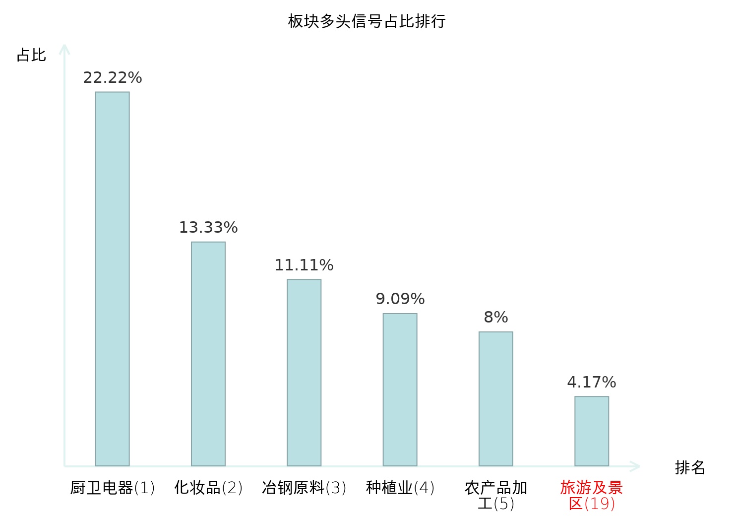 全市场所有行业板块中主力多头信号占比排名中,厨卫电器板块位居第一。化妆品板块名次提升最快,较昨日上升104位。