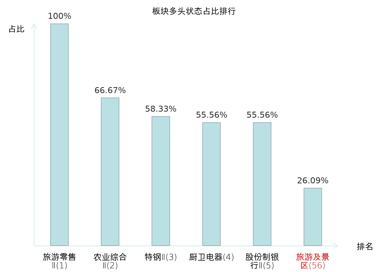 全市场所有行业板块中主力多头状态占比排名中,旅游零售Ⅱ板块位居第一。农业综合Ⅱ板块名次提升最快,较昨日上升127位。