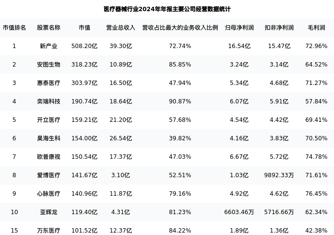万东医疗最新报告期数据为年报,下表汇总了医疗器械行业内市值靠前的公司年报主要经营数据