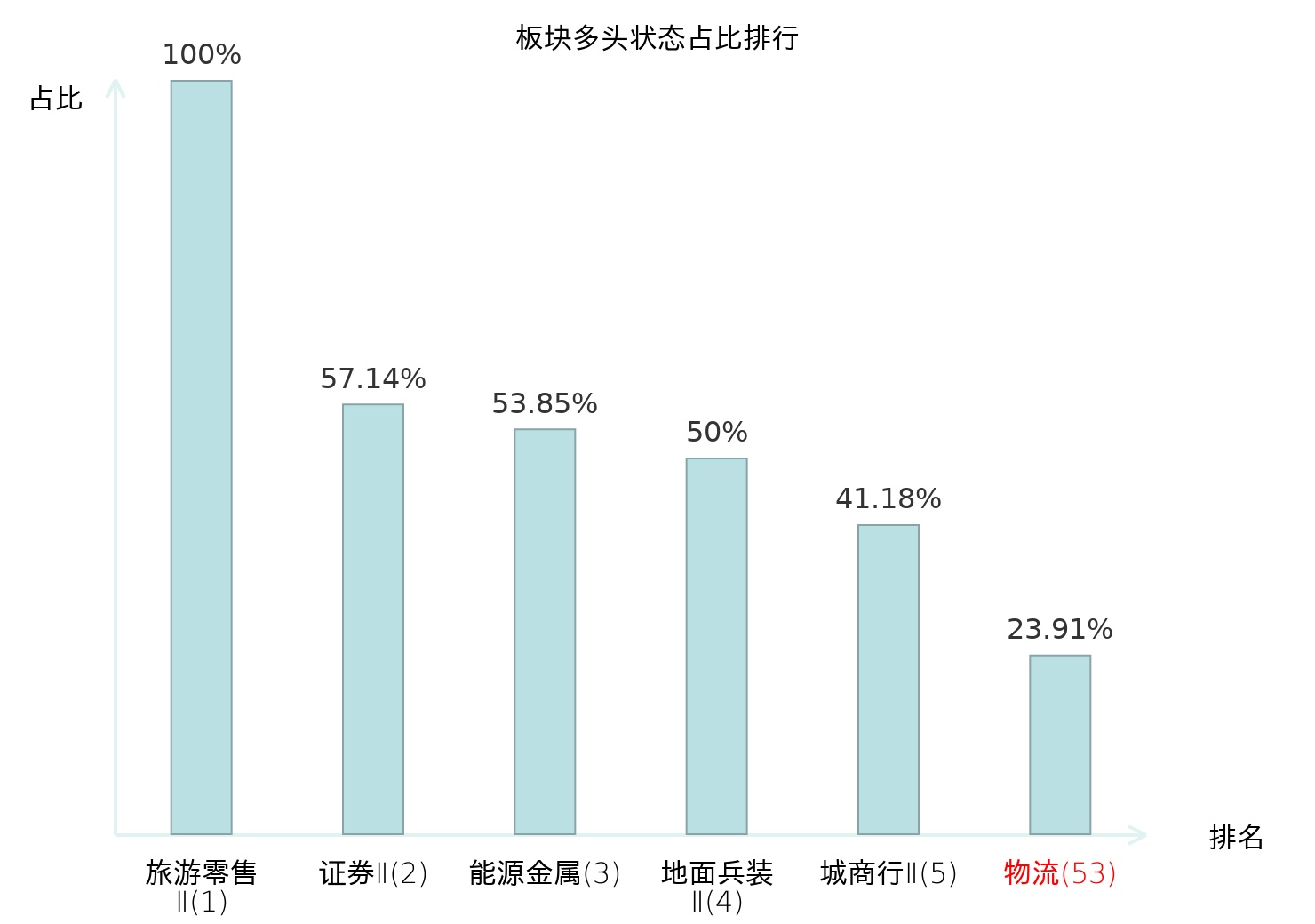 全市场所有行业板块中主力多头状态占比排名中,旅游零售Ⅱ板块位居第一。渔业板块名次提升最快,较昨日上升57位。