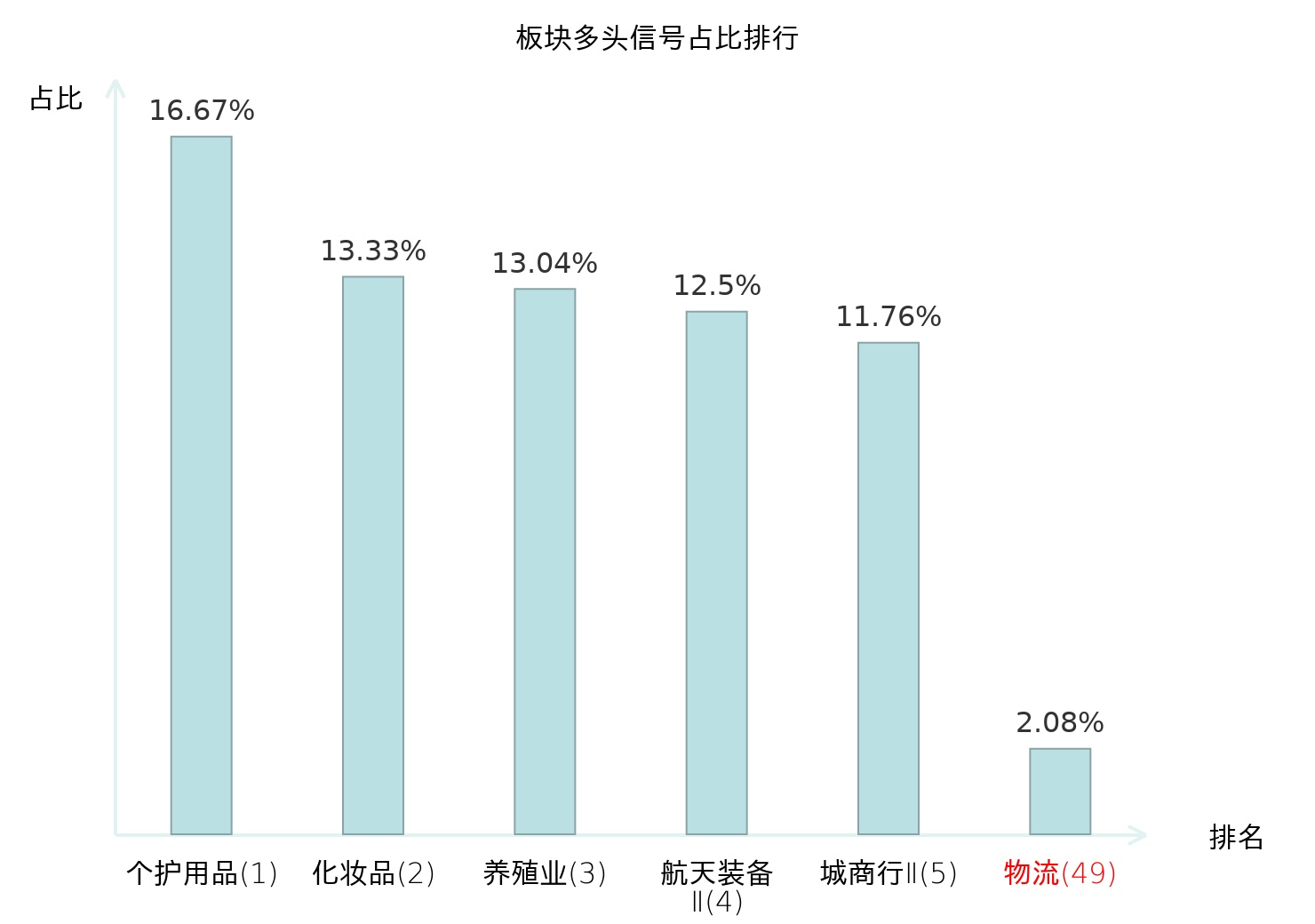 全市场所有行业板块中主力多头信号占比排名中,个护用品板块位居第一。航天装备Ⅱ板块名次提升最快,较昨日上升118位。