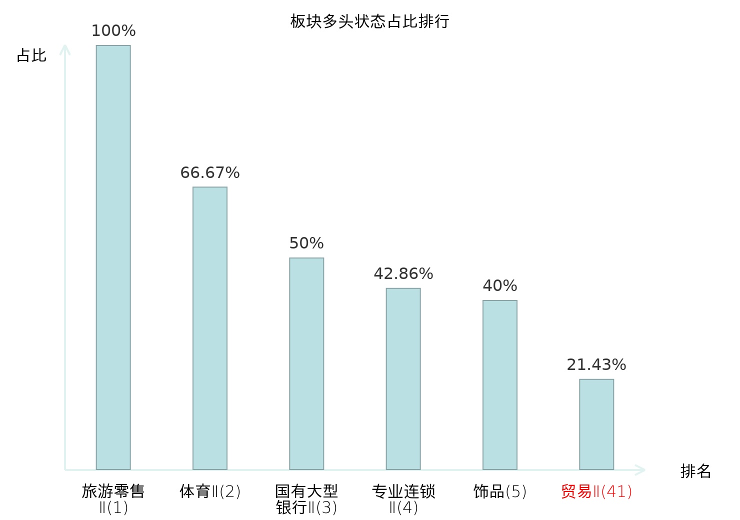 全市场所有行业板块中主力多头状态占比排名中,旅游零售Ⅱ板块位居第一。半导体板块名次提升最快,较昨日上升78位。