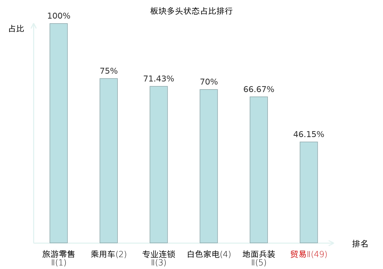 全市场所有行业板块中主力多头状态占比排名中,旅游零售Ⅱ板块位居第一。焦炭Ⅱ板块名次提升最快,较昨日上升105位。