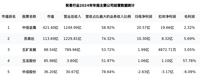 五矿发展最新报告期数据为年报,下表汇总了贸易行业内市值靠前的公司年报主要经营数据