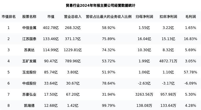 五矿发展最新报告期数据为年报,下表汇总了贸易行业内市值靠前的公司年报主要经营数据