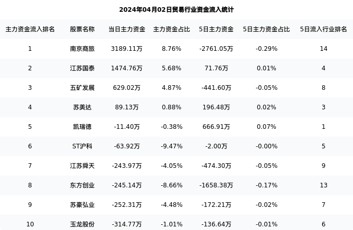 从主力资金流向来看,贸易行业今日主力资金流入4.20亿元,在所有申万二级行业中排名:12/131。