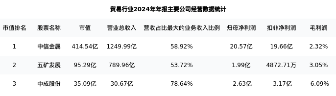 五矿发展最新报告期数据为年报,下表汇总了贸易行业内市值靠前的公司年报主要经营数据