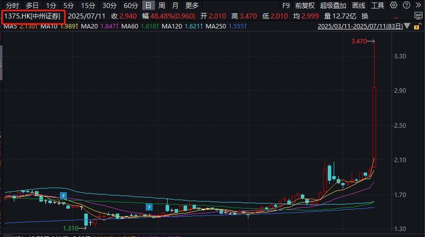 港股中州证券暴涨,盘中涨幅一度超过70%,后涨幅有所收窄。截至发稿,中州证券的成交额已是昨天全天成交额的20倍以上。