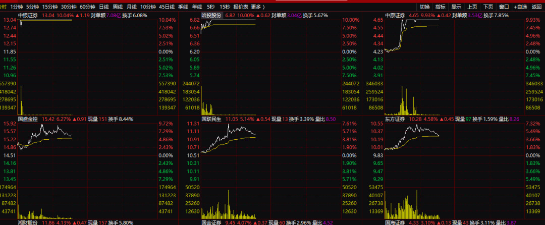 券商板块成交也明显放量,截至发稿,券商板块今天上午半天的成交额已超过该板块昨天全天的成交额。