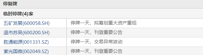 上证报中国证券网讯 12月30日,4家公司临停:五矿发展、退市苏吴、胜通能源、紫光国微,3家公司复牌:*ST东易、*ST中装、东通退。