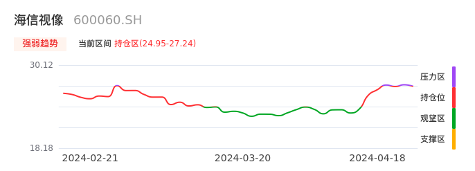 我们来看一下该股的九方特色指标强弱趋势的情况:海信视像近日从压力区回到持仓区。股价快速拉升后出现持续调整,目前出现启稳回暖态势。后续重点关注上方压力位:27.24元是否能再次上攻。