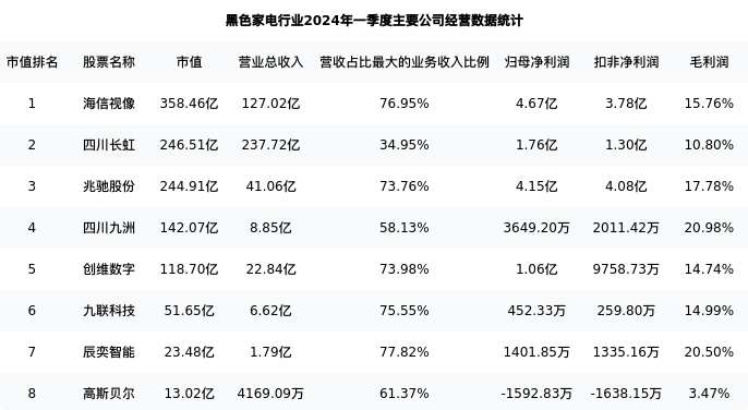 海信视像最新报告期数据为一季度,下表汇总了黑色家电行业内市值靠前的公司一季度主要经营数据