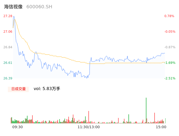 04月25日,海信视像收报26.62,股价涨幅-1.66%,成交金额1.55亿元,换手率0.45%。
