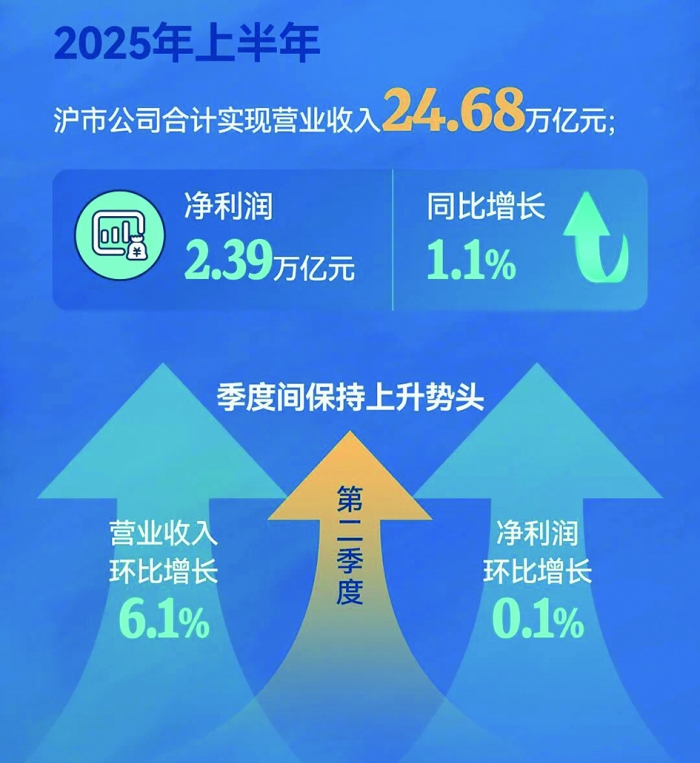 8月31日,上交所发布沪市上市公司2025年半年报综述。截至8月31日,逾2280家沪市公司完成半年报披露,合计实现营业收入24.68万亿元,同比微降1.3%;实现净利润2.39万亿元,同比增长1.1%;实现扣非后净利润2.29万亿元,同比增长0.7%。
