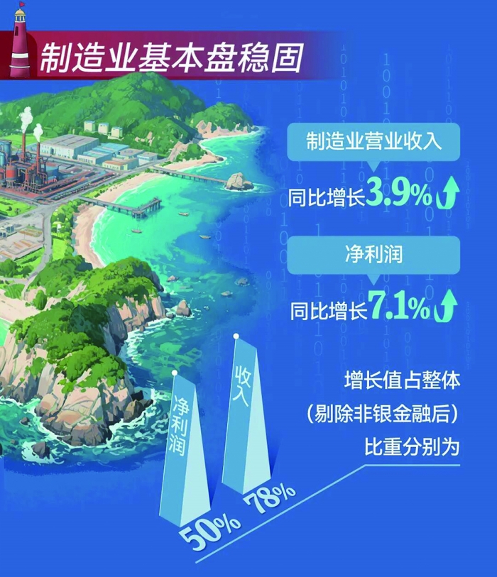 分行业看,制造业基本盘稳固。制造业营业收入、净利润同比分别增长3.9%、7.1%,增长值占剔除非银金融后的整体比重分别为78%、50%。新兴产业势头更劲,电子、通信、医药生物、轨交设备等新兴产业营收和净利润增速分别为7.5%、6.5%。近五年新兴产业营收占制造业及相关服务业比重从39%增长至49%,利润占比从33%增长至50%。