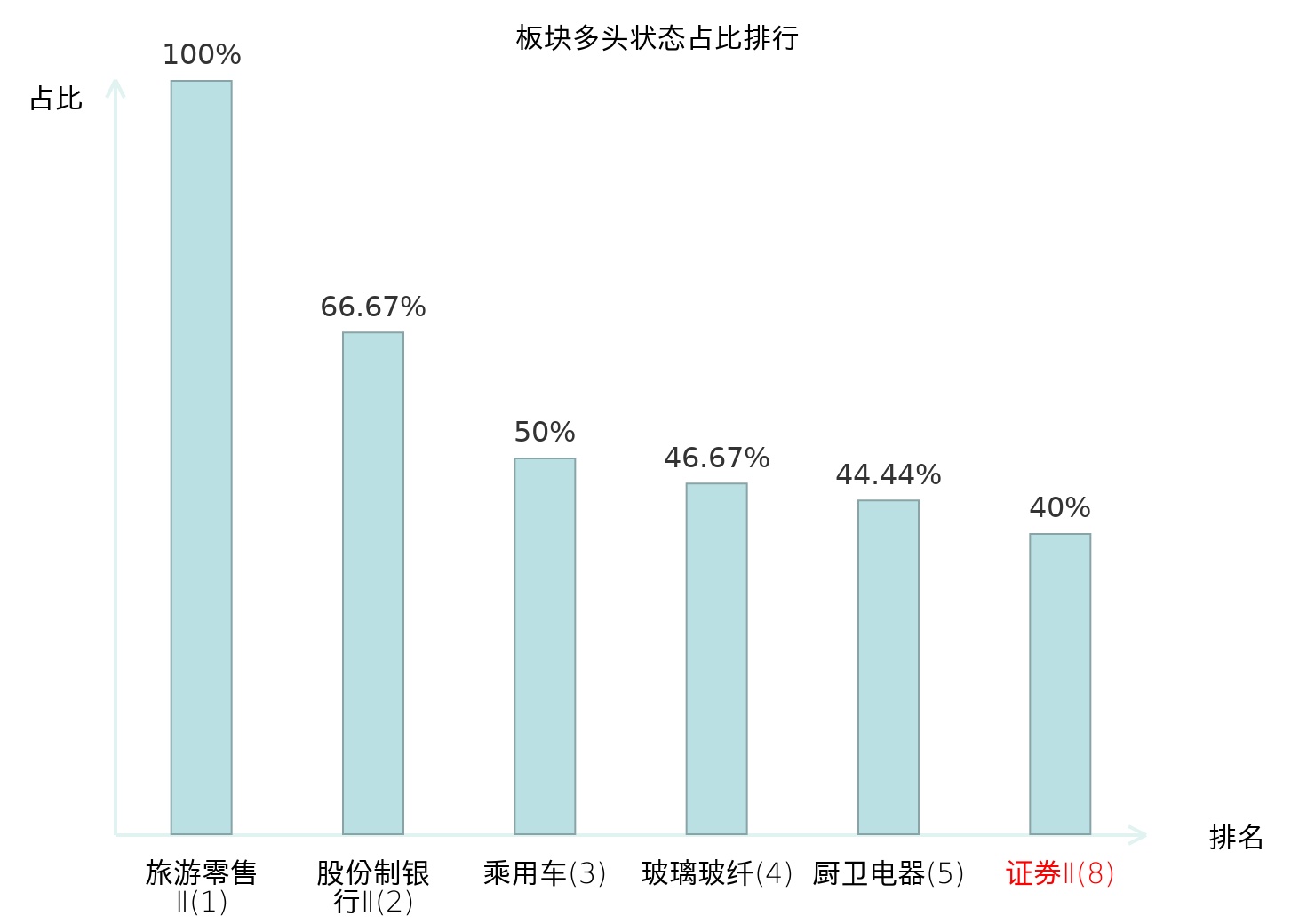 全市场所有行业板块中主力多头状态占比排名中,旅游零售Ⅱ板块位居第一。农产品加工板块名次提升最快,较昨日上升72位。