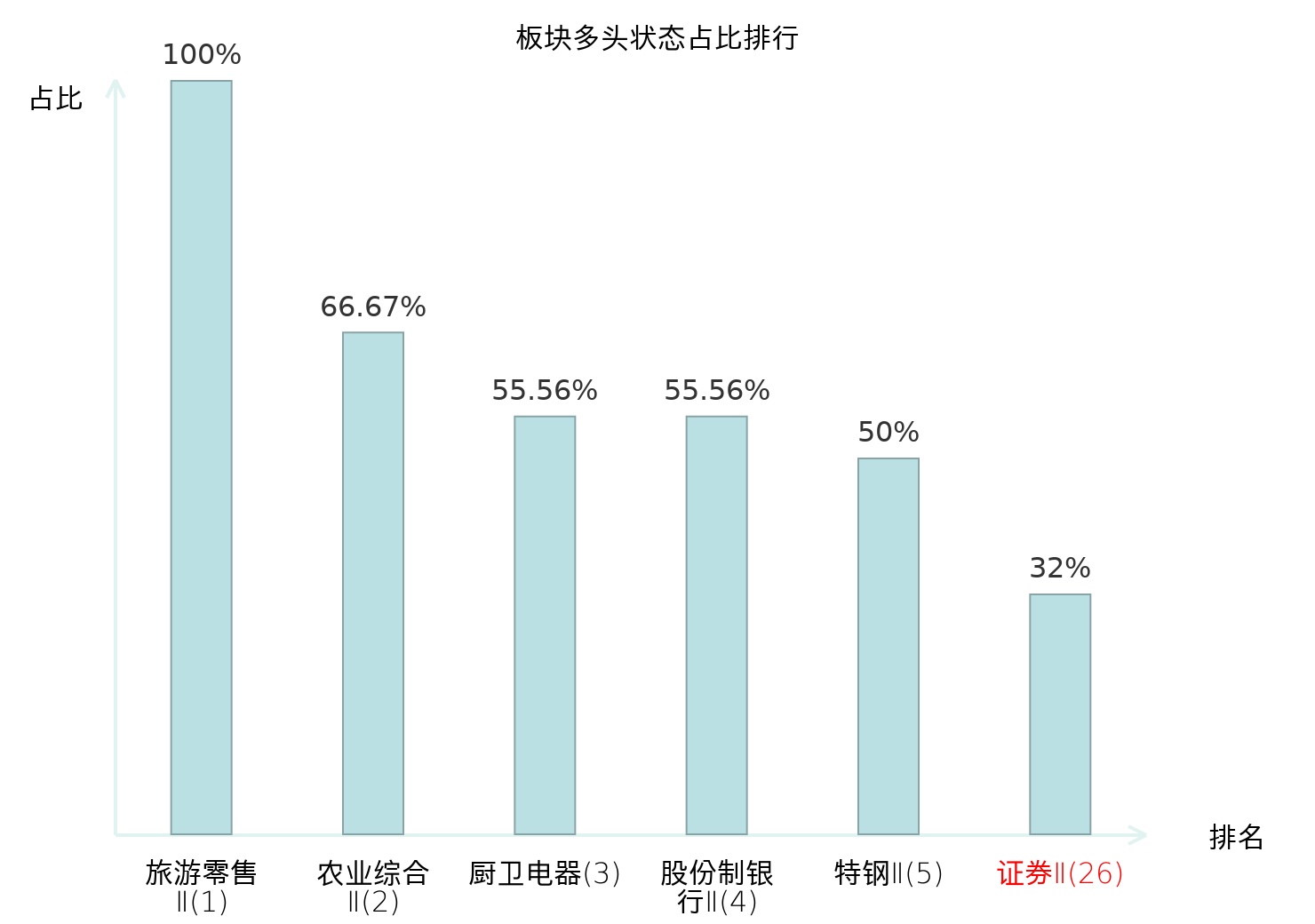 全市场所有行业板块中主力多头状态占比排名中,旅游零售Ⅱ板块位居第一。装修装饰Ⅱ板块名次提升最快,较昨日上升75位。