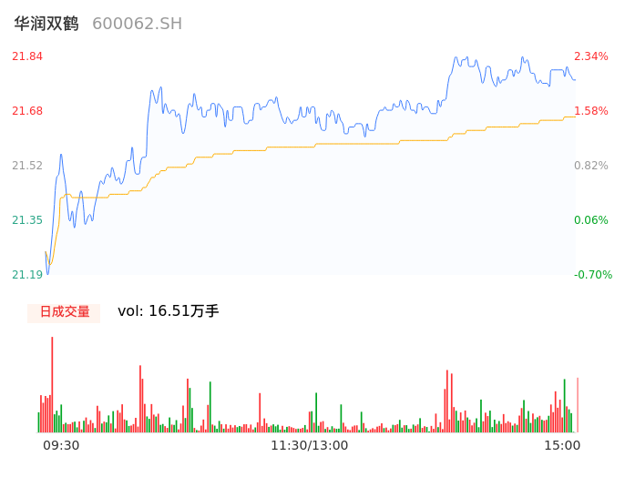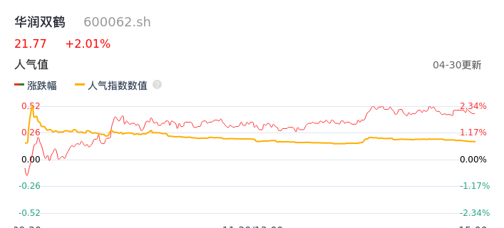 04月30日,华润双鹤收报21.77,股价涨幅2.01%,成交金额3.58亿元,换手率1.61%。