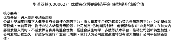 值得注意的是:2024年04月湘财证券的张德燕分析师,首次发布关于华润双鹤的研究报告,标题为:华润双鹤(600062):优质央企慢病制药平台 转型提升创新价值。