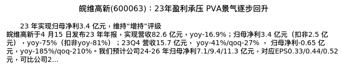 值得注意的是:2024年04月华泰证券的庄汀洲/张雄分析师,首次发布关于皖维高新的研究报告,标题为:皖维高新(600063):23年盈利承压 PVA景气逐步回升。