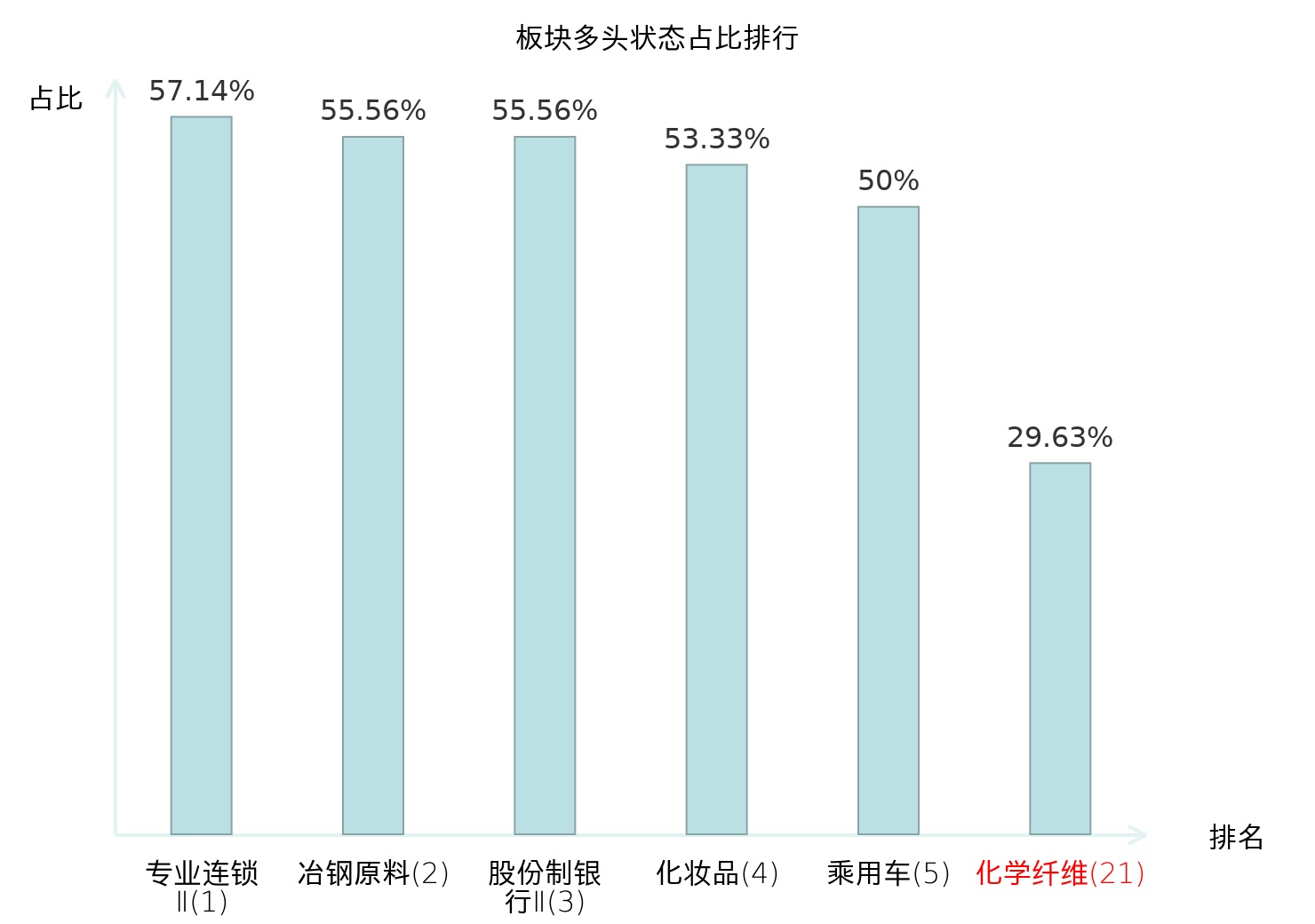 全市场所有行业板块中主力多头状态占比排名中,专业连锁Ⅱ板块位居第一。房地产服务板块名次提升最快,较昨日上升52位。