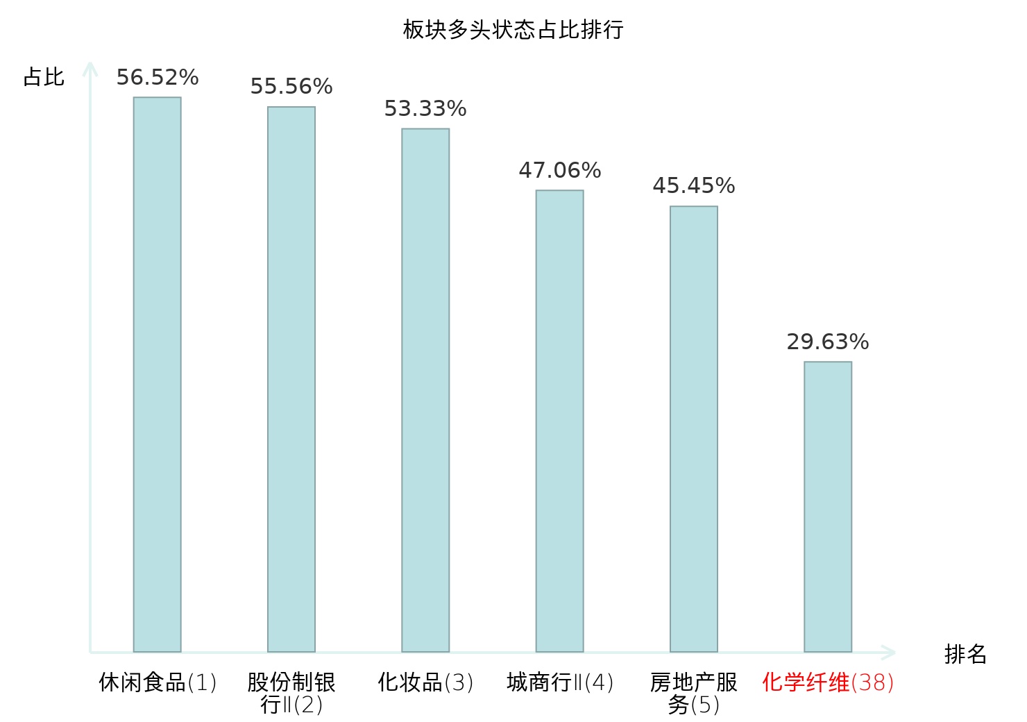 全市场所有行业板块中主力多头状态占比排名中,休闲食品板块位居第一。汽车服务板块名次提升最快,较昨日上升90位。