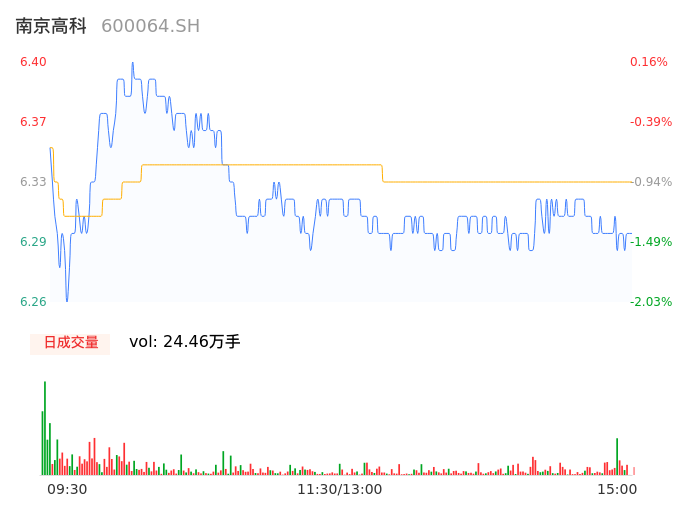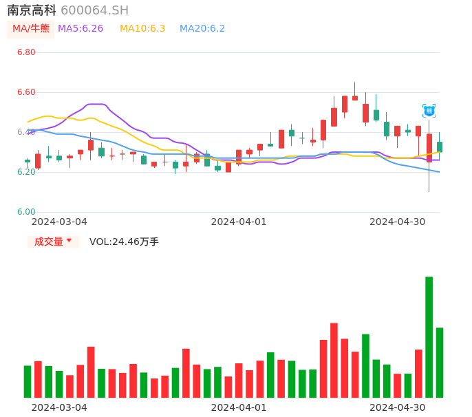 04月30日,南京高科收报6.30,股价涨幅-1.41%,成交金额1.55亿元,换手率1.41%。
