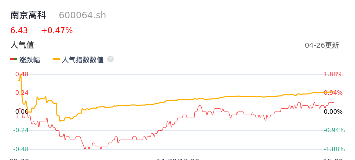04月26日,南京高科收报6.43,股价涨幅0.47%,成交金额1.07亿元,换手率0.97%。