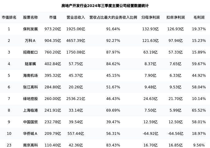 南京高科最新报告期数据为三季度,下表汇总了房地产开发行业内市值靠前的公司三季度主要经营数据