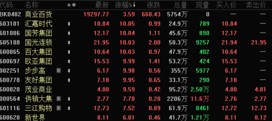 与此同时,消费股及高股息板块上涨,农业银行大涨超5%,股价再创新高;消费板块中的细分领域商业百货、食品饮料和旅游酒店涨幅靠前。
