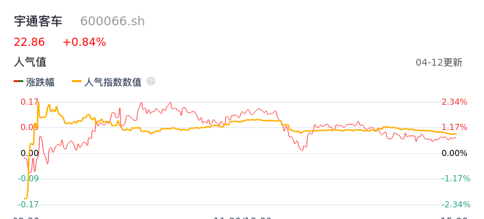 04月12日,宇通客车收报22.86,股价涨幅0.84%,成交金额4.89亿元,换手率0.97%。